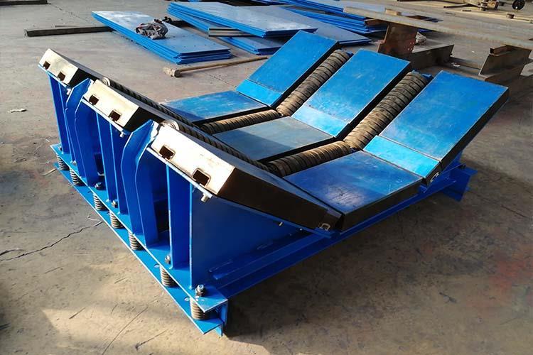 皮帶機緩沖床主要用于皮帶機導(dǎo)料槽下方的落料口處,當物料下落時,緩沖床利用自身彈性對物料下落到皮帶上的沖擊力進行處理,使沖擊力達到很小,以保證皮帶機正常運行。皮帶機緩沖床的表層緩沖條擁有五百萬分子量的高分子聚乙烯板面,該高板于皮帶呈面面接觸,使?jié)櫥赃_到很高,摩擦系數(shù)降至很低。